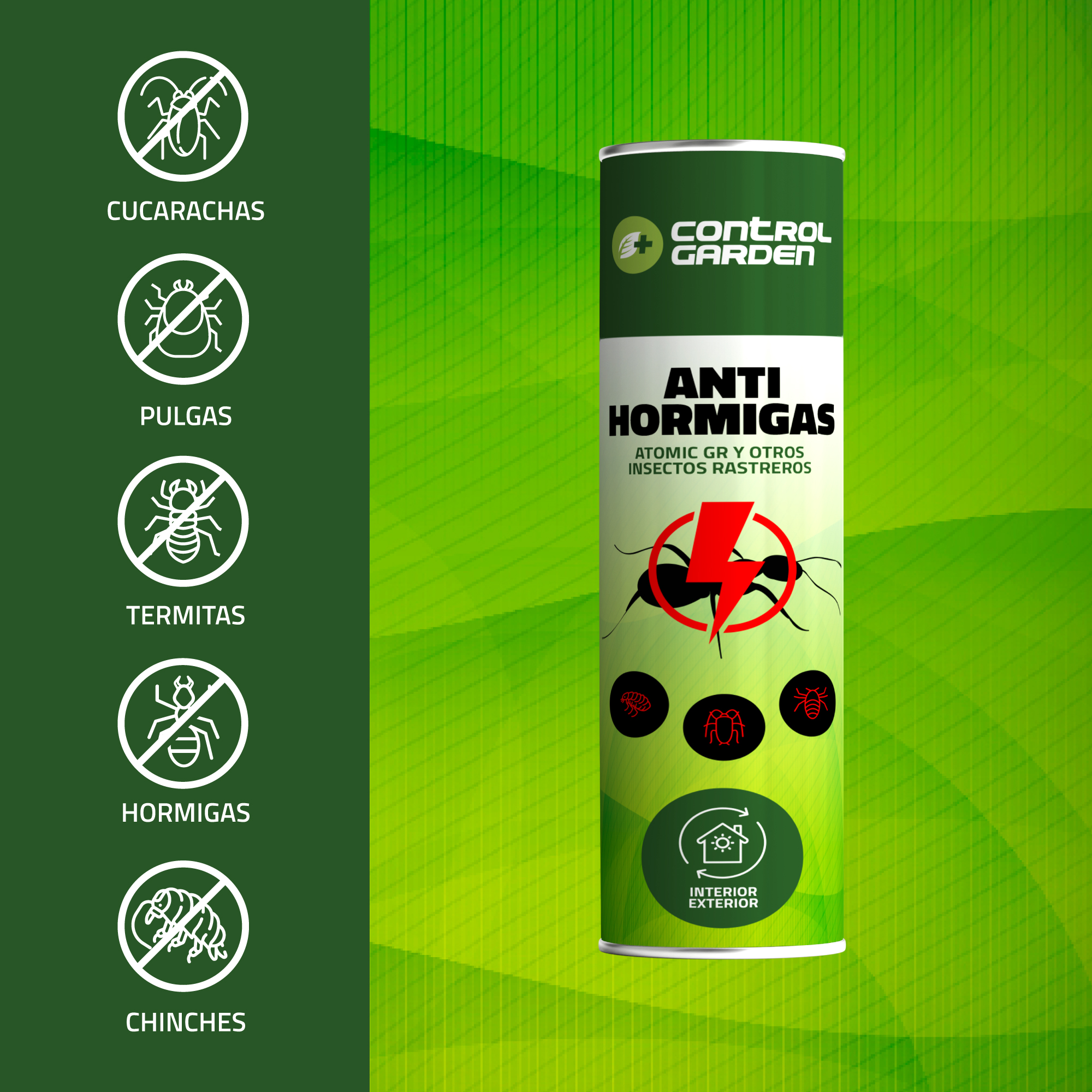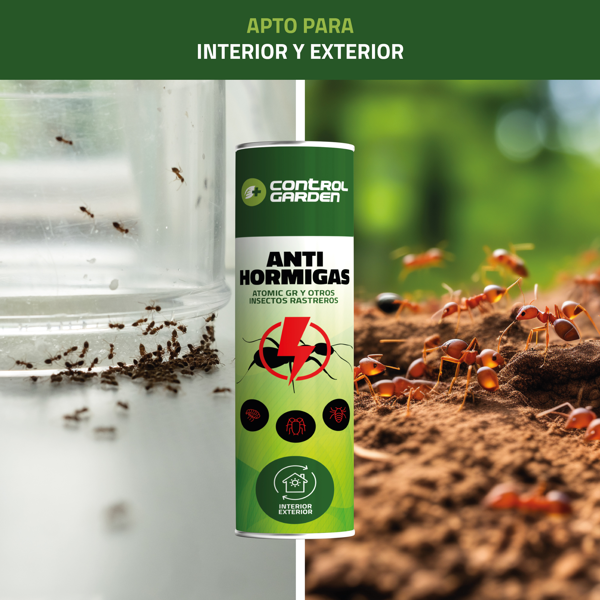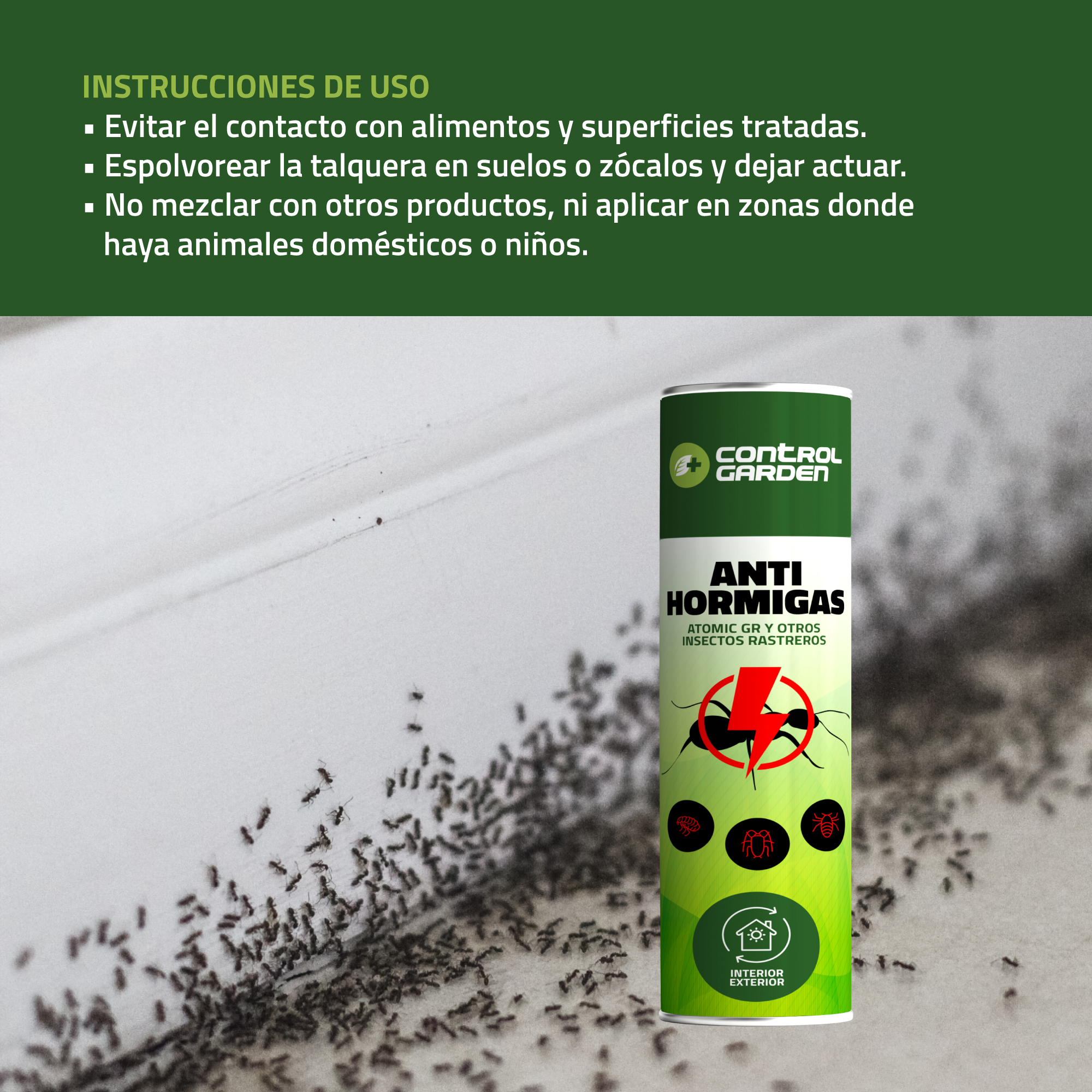 - Control total de hormigas: Ataca directamente a las colonias y crea una barrera protectora.