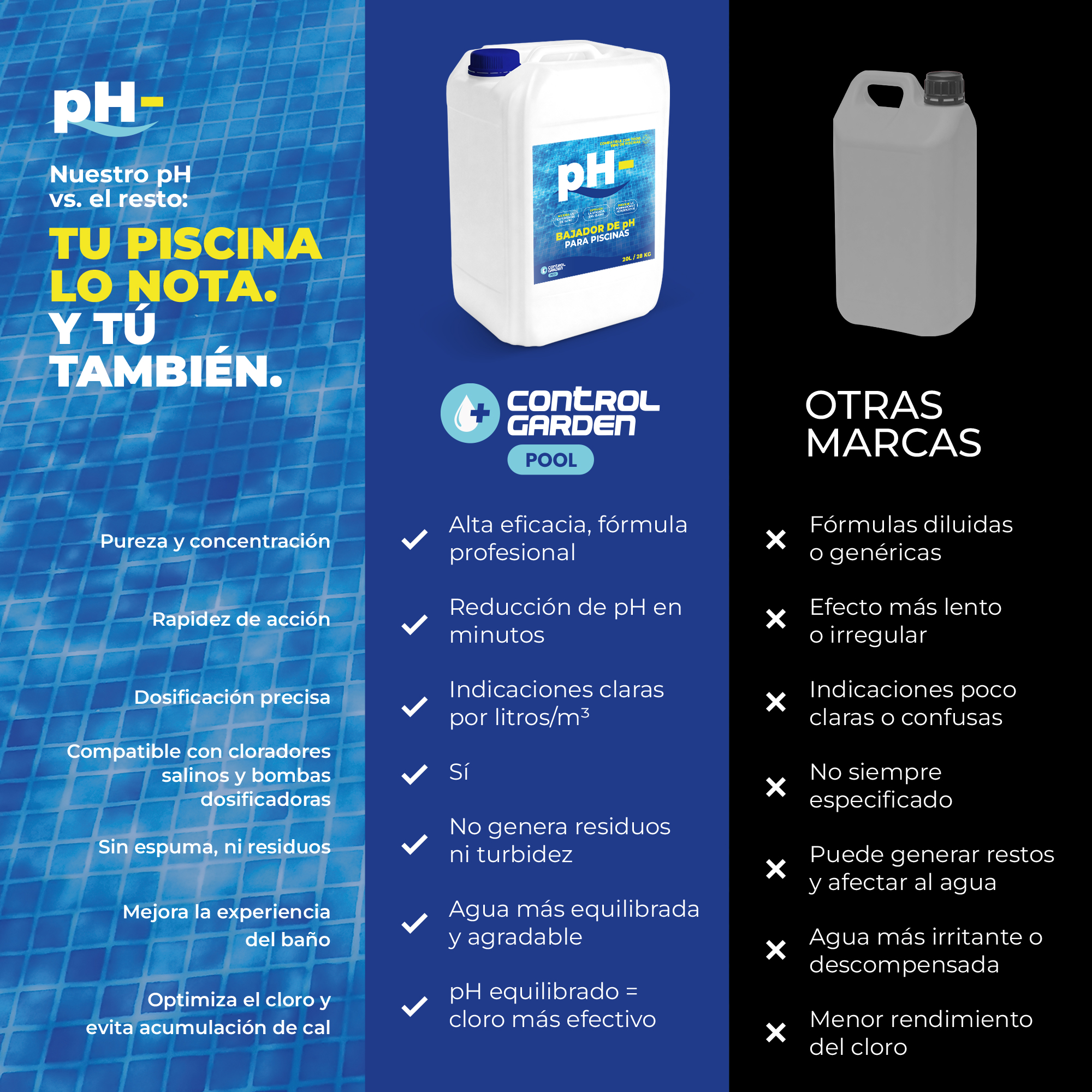 Los productos de Control Garden están diseñados para ofrecer soluciones sencillas y eficaces en el cuidado de la piscina. Este reductor de pH líquido es fácil de dosificar, compatible con los sistemas de filtración habituales y se integra sin complicaciones en cualquier rutina de mantenimiento.