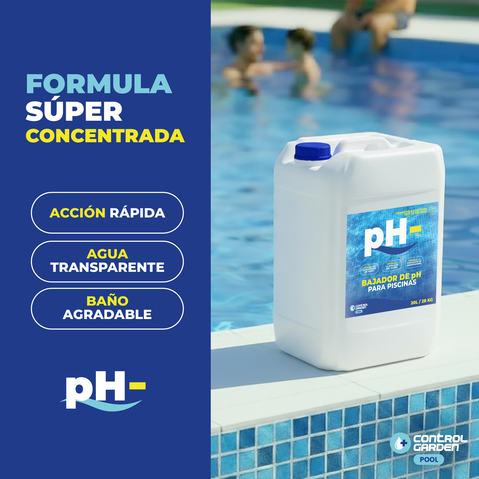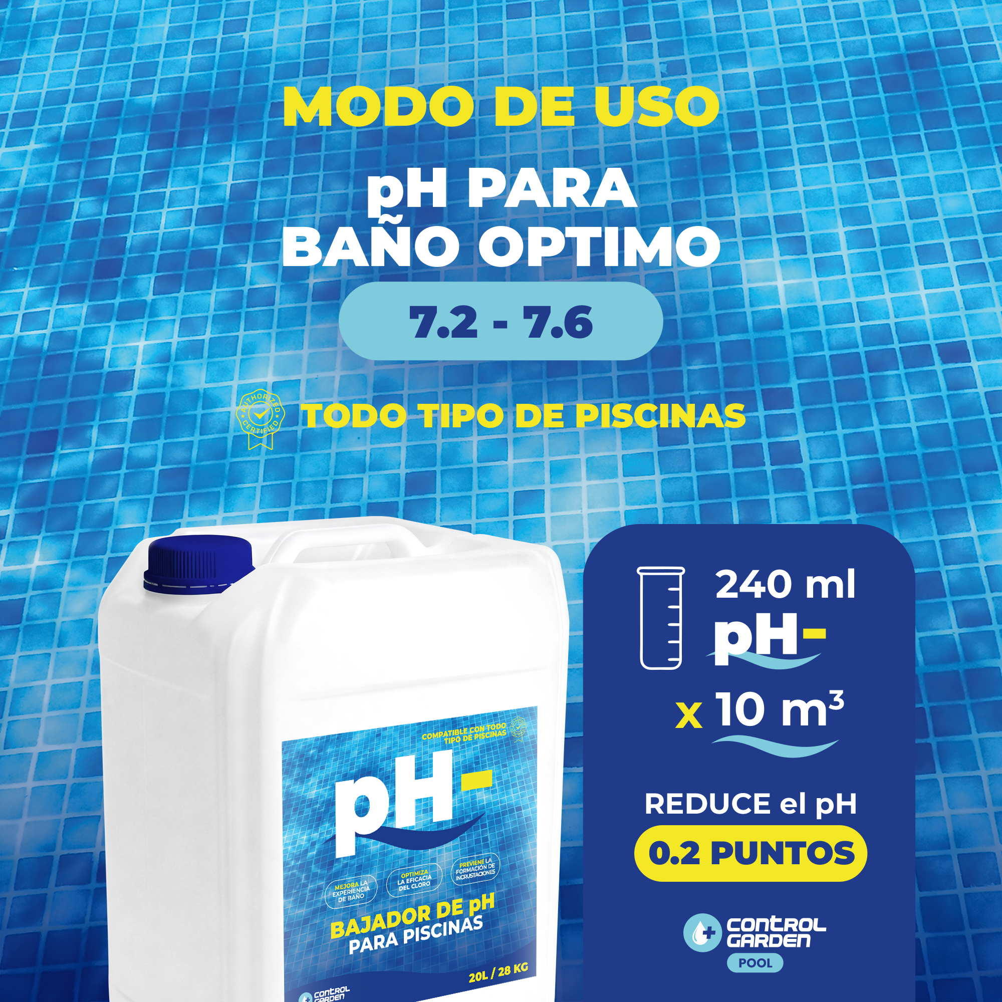 El bajador de pH Control Garden 20 L está pensado para quienes buscan un producto de alto rendimiento que permita espaciar las reposiciones y simplificar el mantenimiento. Es una opción ideal tanto para piscinas privadas de gran tamaño como para instalaciones comunitarias, hoteles o centros deportivos.