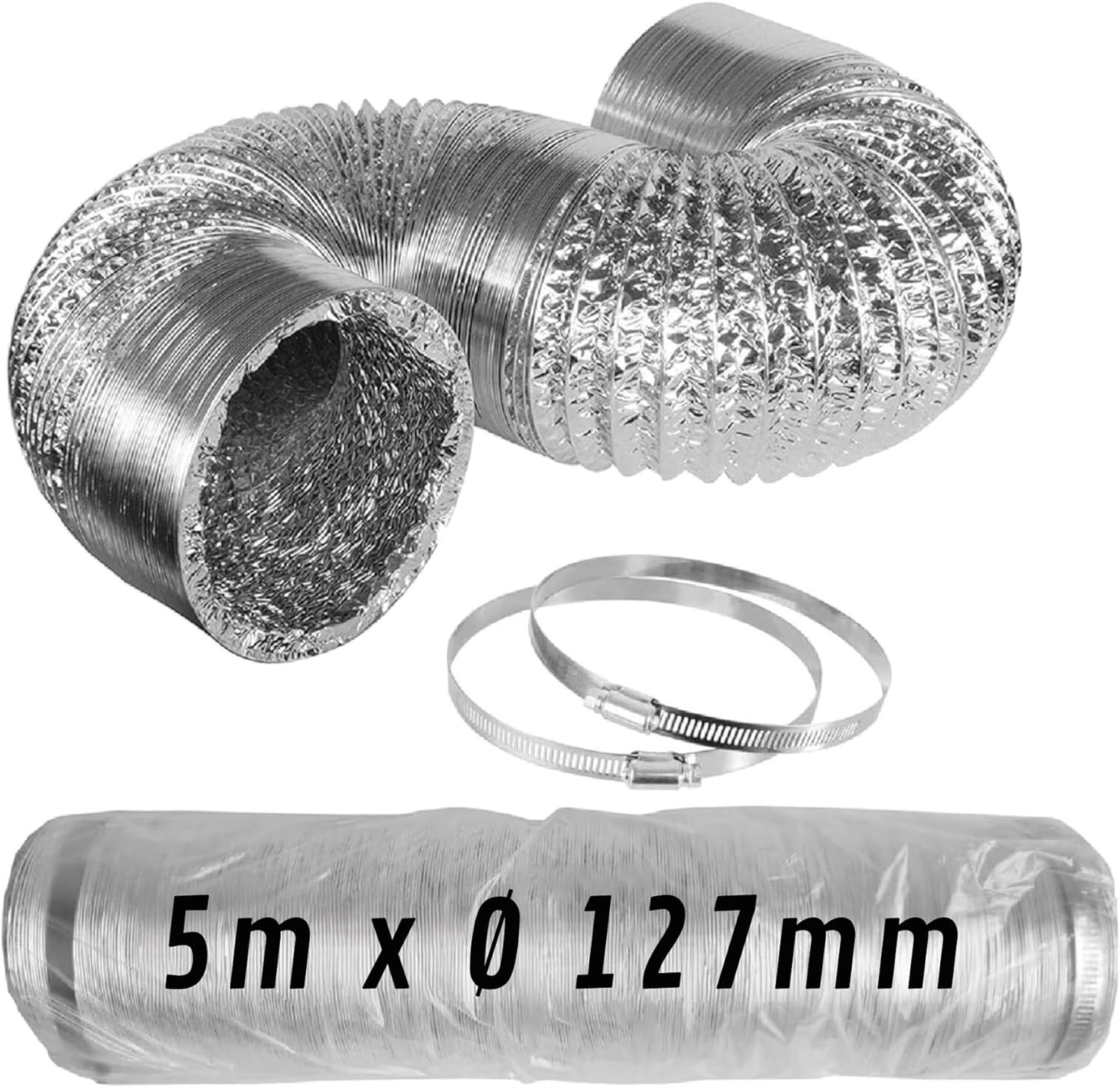 Tubo flexible de aluminio plateado de 127 mm y 5 m de longitud, con 2 abrazaderas incluidas. Perfecto para instalaciones de ventilación más largas. Alta durabilidad y excelente flujo de aire.