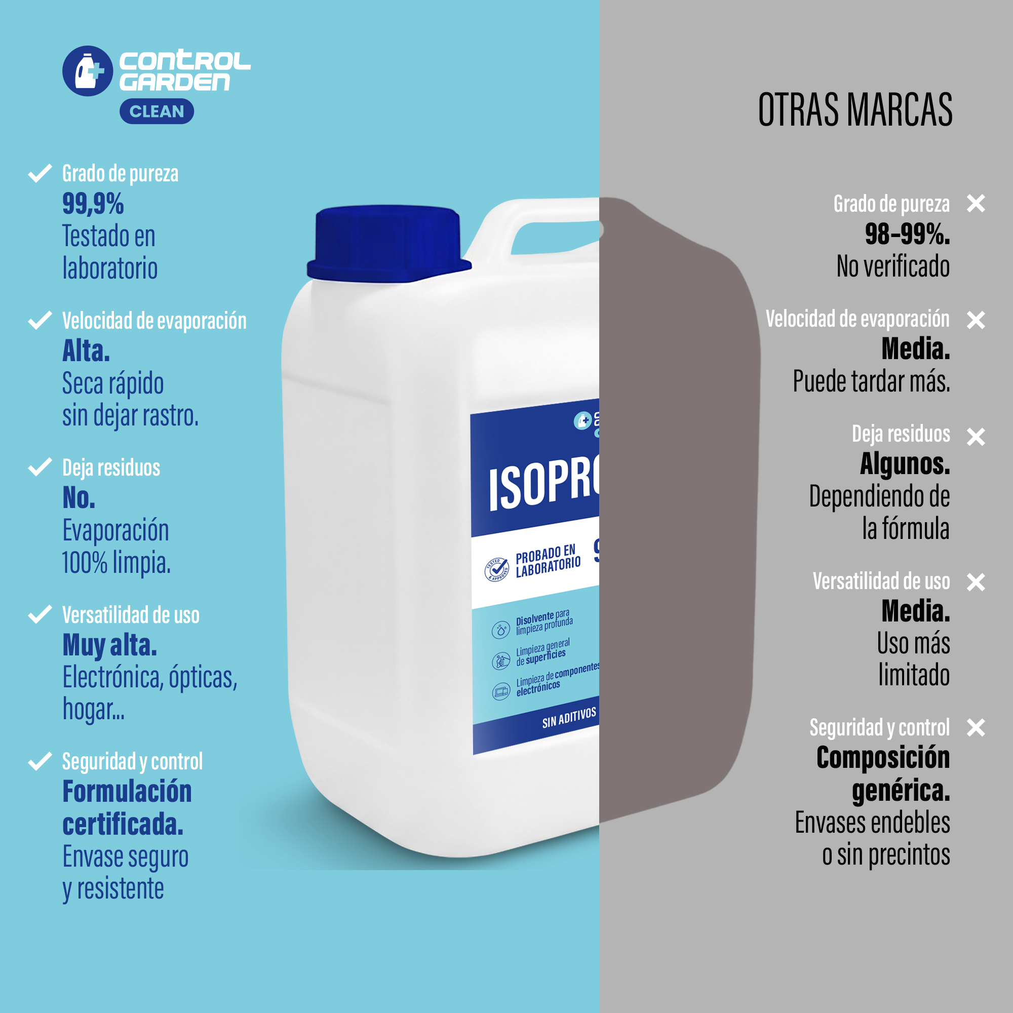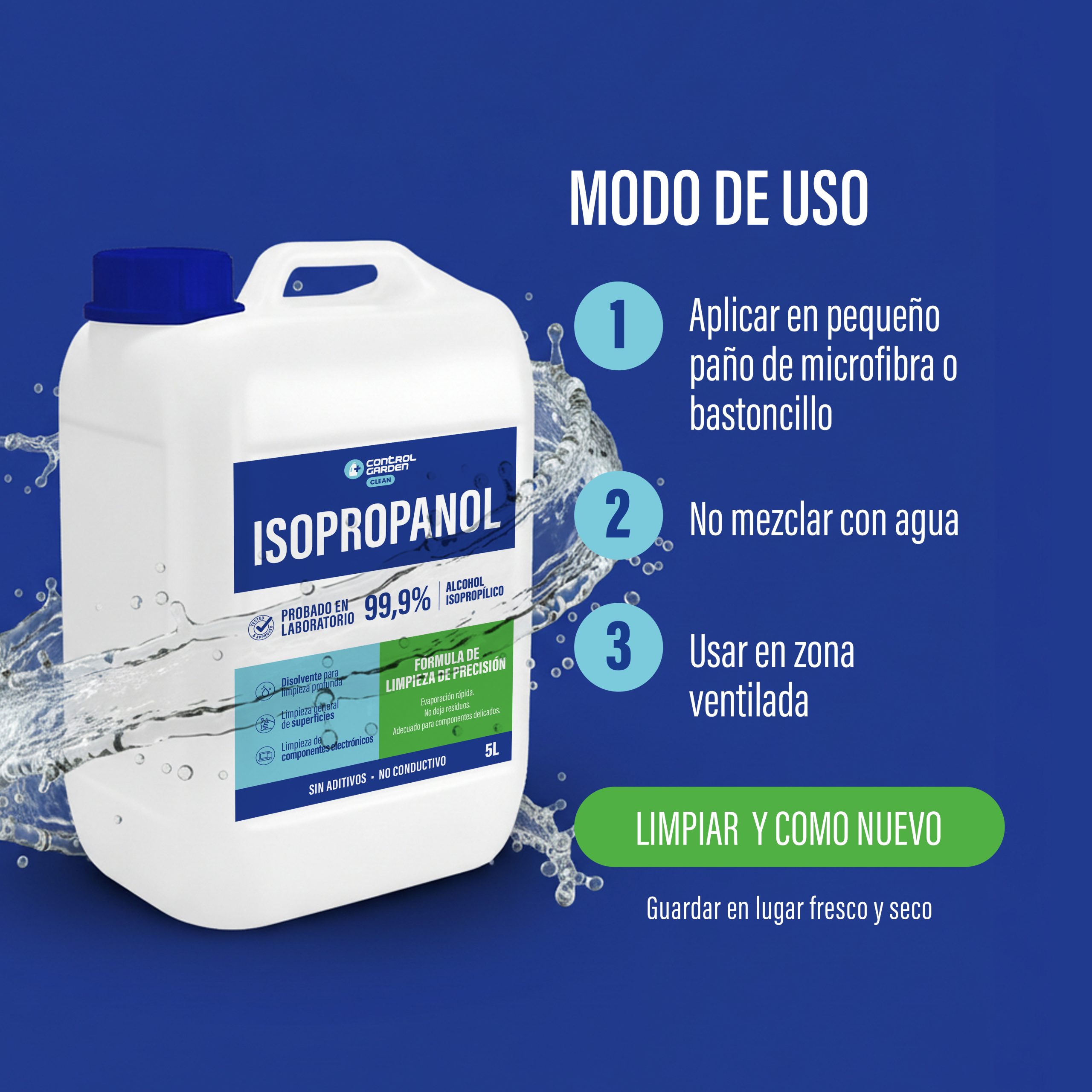 Con el alcohol isopropílico Control Garden en formato 10 litros tienes la tranquilidad de contar con un producto de alto rendimiento, fiable y preparado para acompañarte en los trabajos más intensivos, ofreciendo siempre un resultado limpio, rápido y seguro.